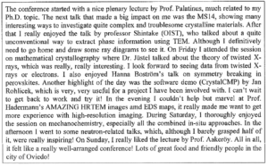 ECM31 gave me a precious opportunity to talk to excellent crystallographers from all over the world. Ideas were exchanged, results were discussed, and future career opportunities could also be developed from here. I work in the specific field of electron crystallography, and ECM has always been the spot where all electron crystallographers come and talk about the frontiers of their own work. This is very essential for me to get the idea about how the field has developed over the past year, and what the current problems are. As an electron crystallographer, it is always useful to talk to x-ray crystallographers and get some idea from them, and ECM is the right place to meet them. In addition, I also went to the crystallographic computing forum right before ECM in Mieres, Spain, and there I had the chance to talk to all the participants in the field of method and software development in crystallography. As a PhD student working in this particular field, talking to them gave me a lot of inspiration for my own work, as well as the detailed implementations in terms of software and algorithm development.